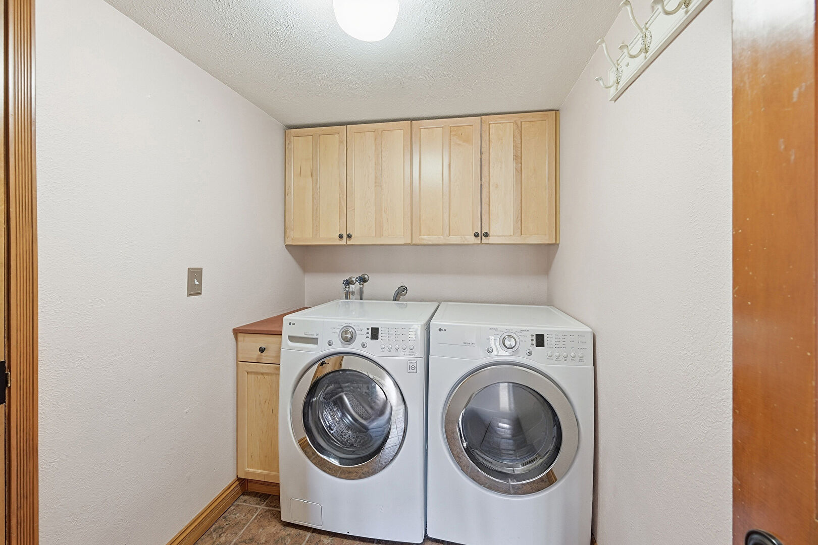 Laundry, Textured Ceiling, Textured Wall, Tile Floor, Washer Hookup, Baseboards Wall