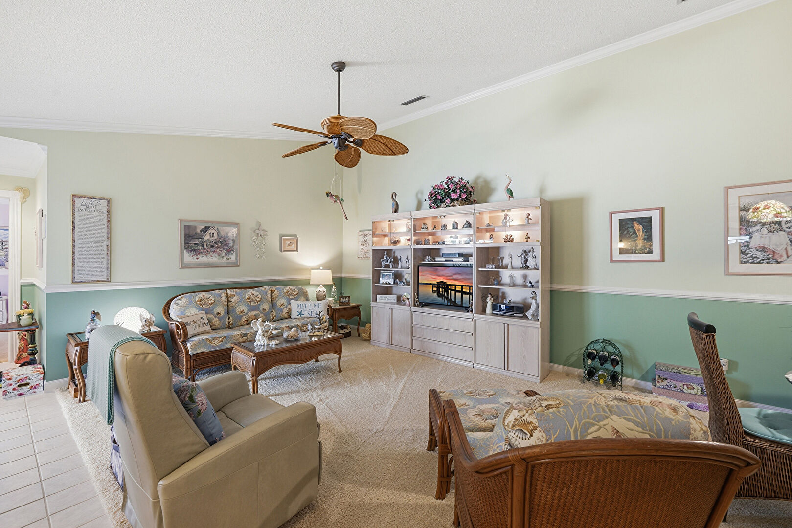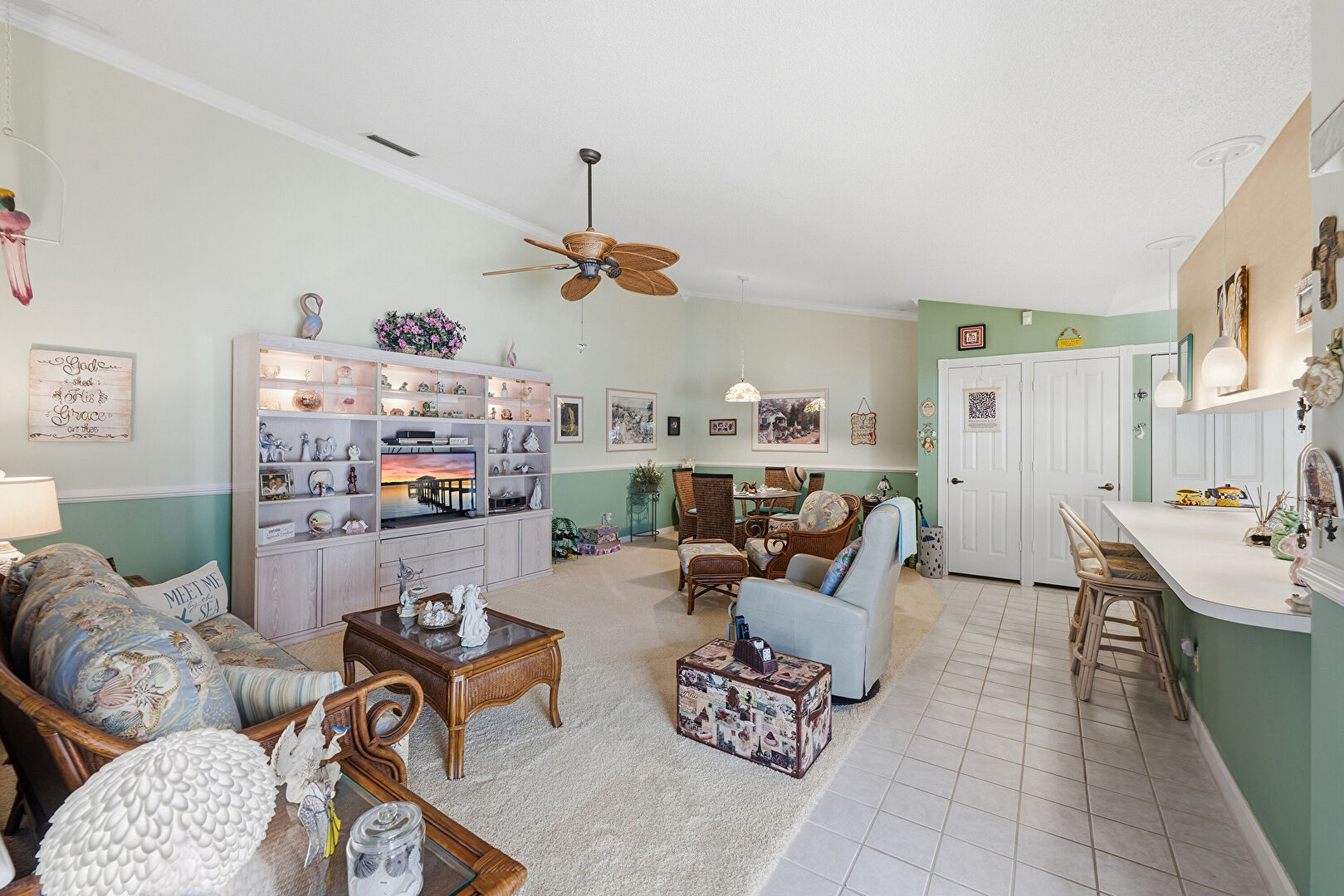 Carpet, Ceiling Fan, Crown Molding, Drywall, High Ceiling, Natural Light, Tile Floor, Vaulted Ceiling, Vent, Baseboards Wall, Carpet