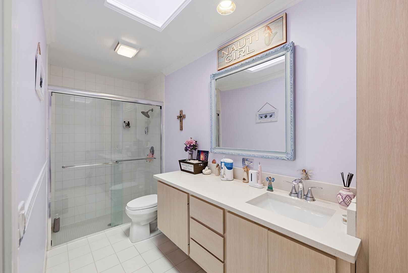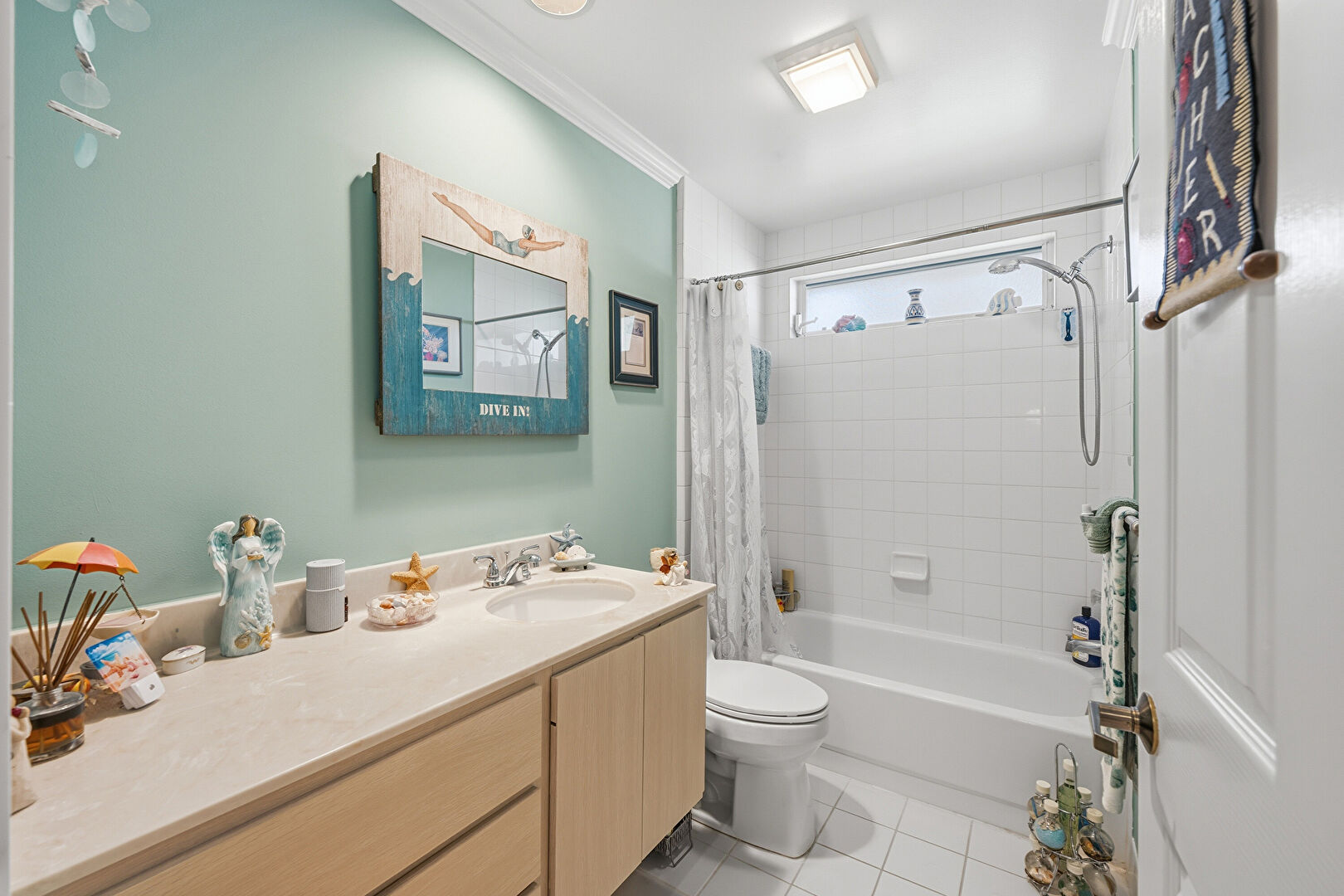 Combined Bath Shower, Crown Molding, Drywall, Full Bathroom, Natural Light, Tile Floor, Vanity