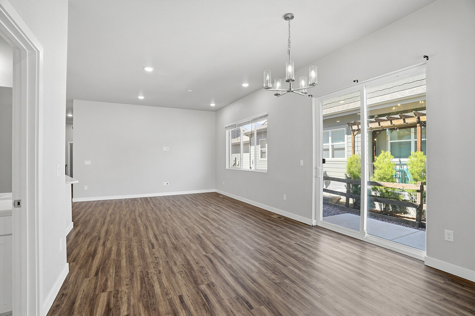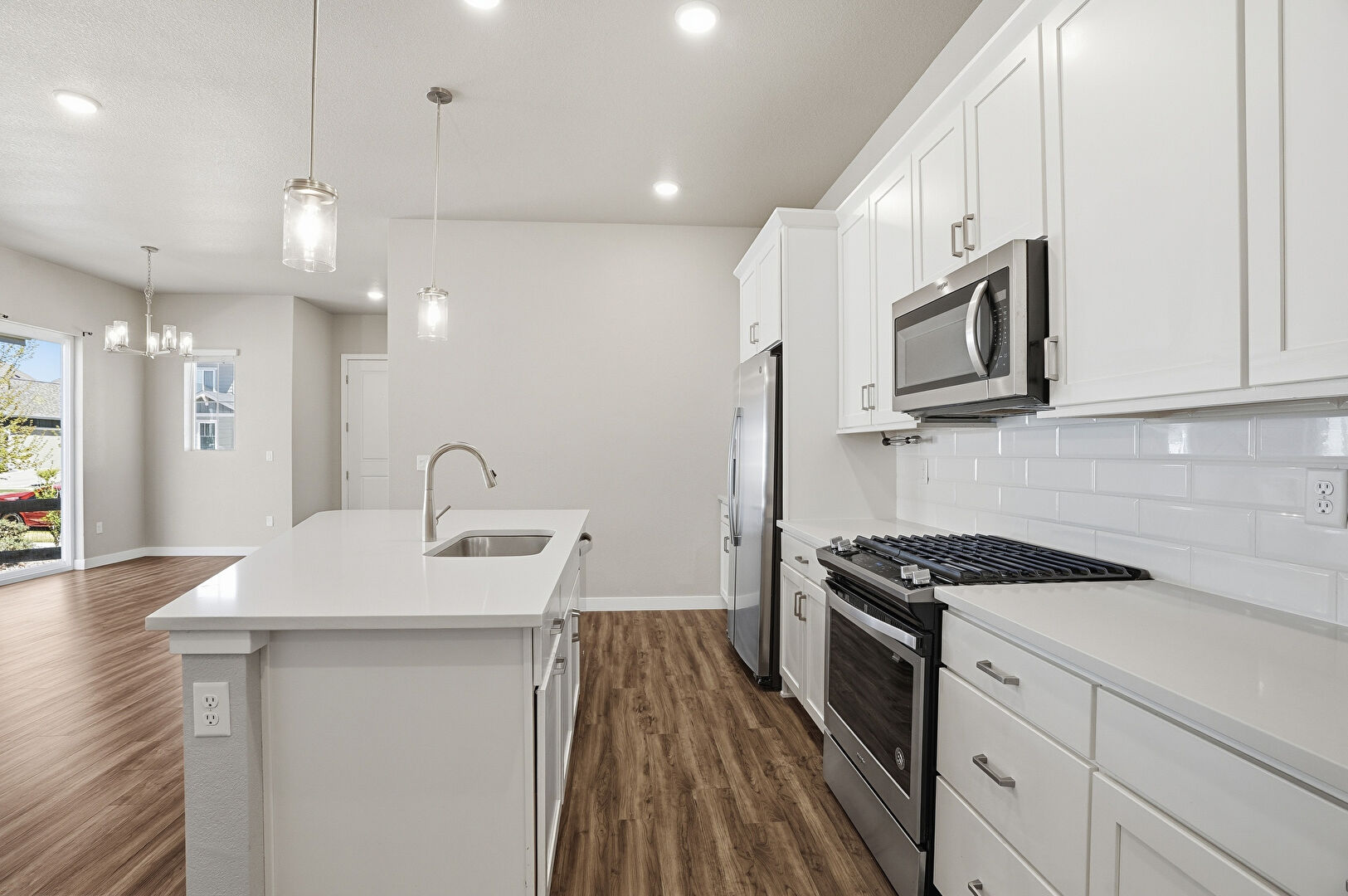 Baseboards Wall, Crown Molding Cabinets, Drywall, Kitchen Bar, Kitchen Island, Natural Light, Notable Chandelier, One Wall Kitchen, Pendant Lighting, Recessed Lighting, Shaker Cabinets, Stone Countertops, Wood Finish Floor, Drywall, Recessed Lighting