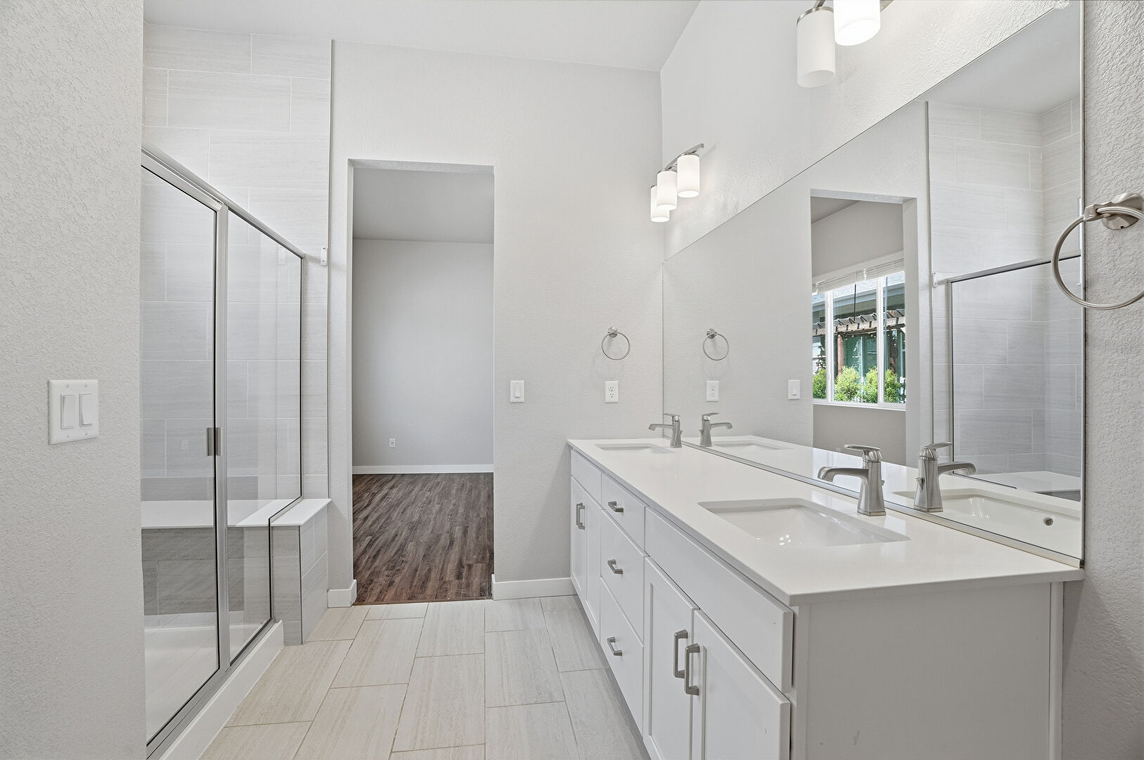 Baseboards Wall, Double Vanity, Full Bathroom, Natural Light, Textured Wall, Wood Finish Floor