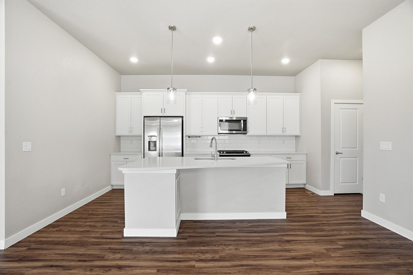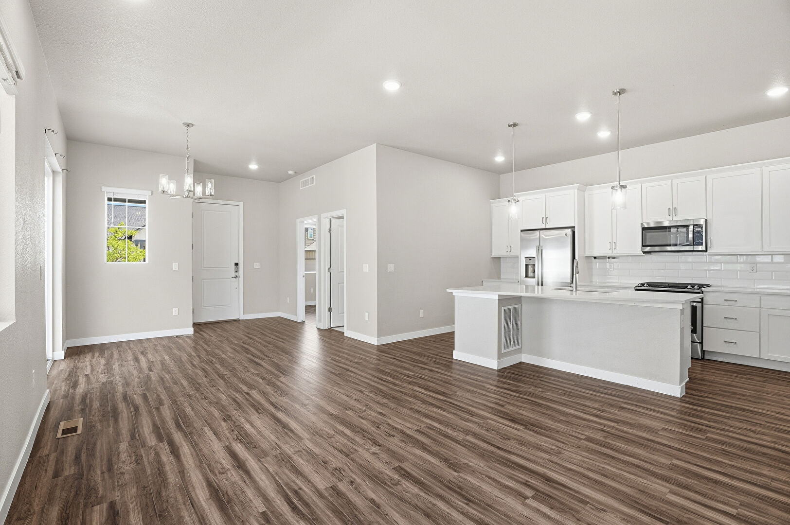 Baseboards Wall, Crown Molding Cabinets, Drywall, Kitchen Island, Natural Light, Notable Chandelier, One Wall Kitchen, Opens To Living Area, Pendant Lighting, Recessed Lighting, Shaker Cabinets, Stone Countertops, Vent, Wood Finish Floor, Drywall, Notable Chandelier