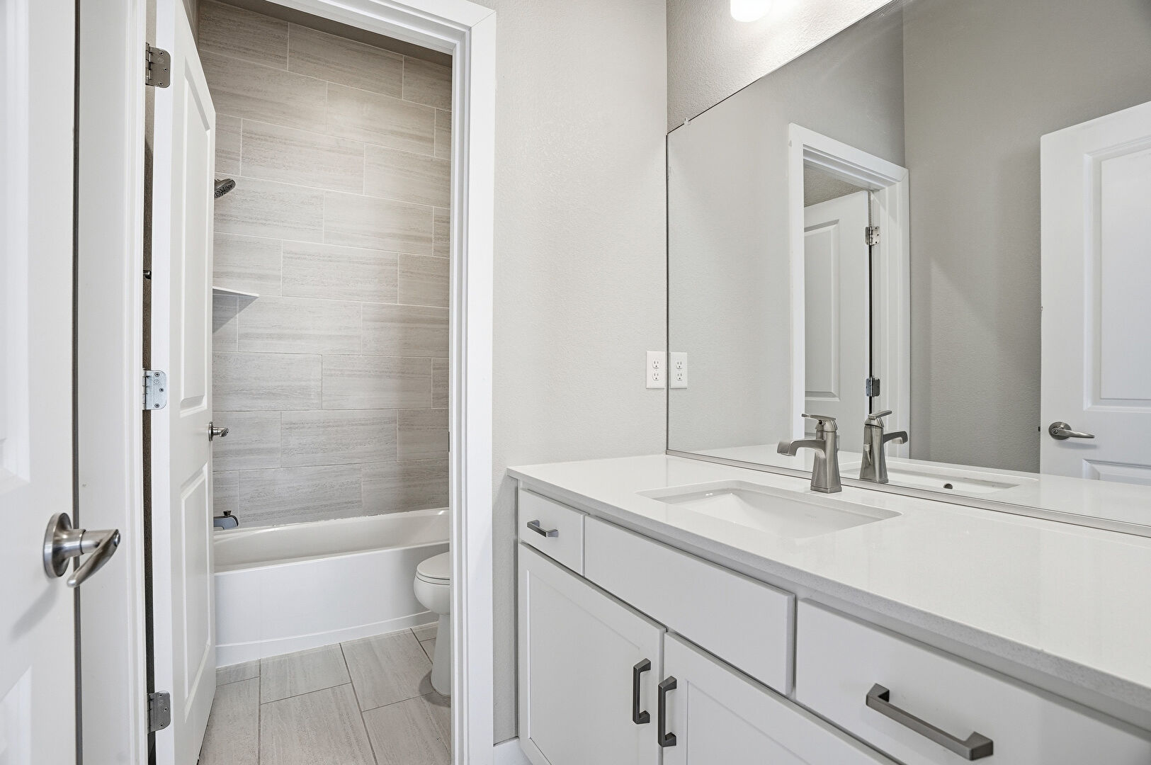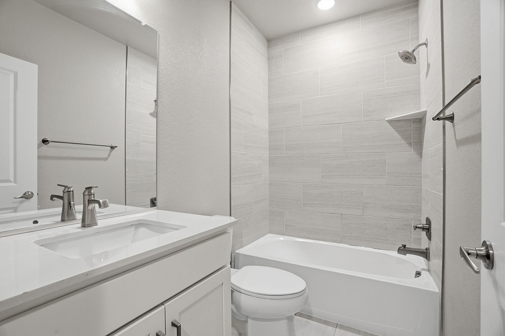 Drywall, Full Bathroom, Recessed Lighting, Textured Wall, Tile Floor, Vanity, Combined Bath Shower