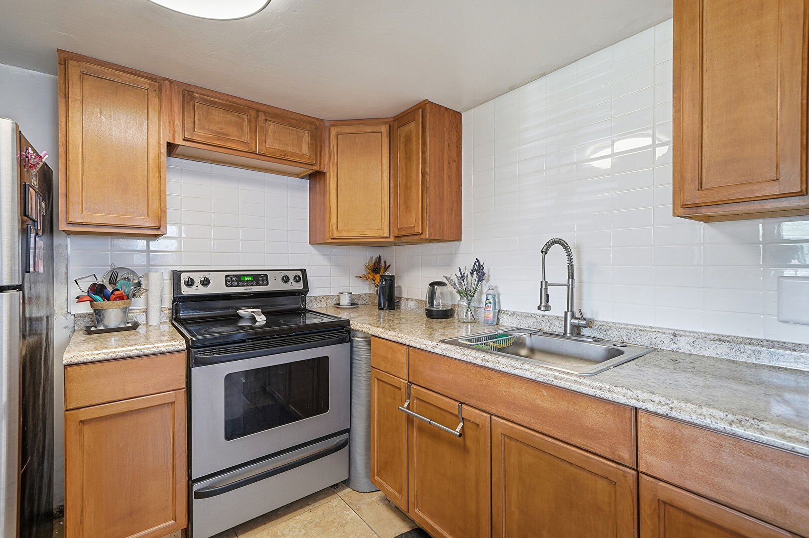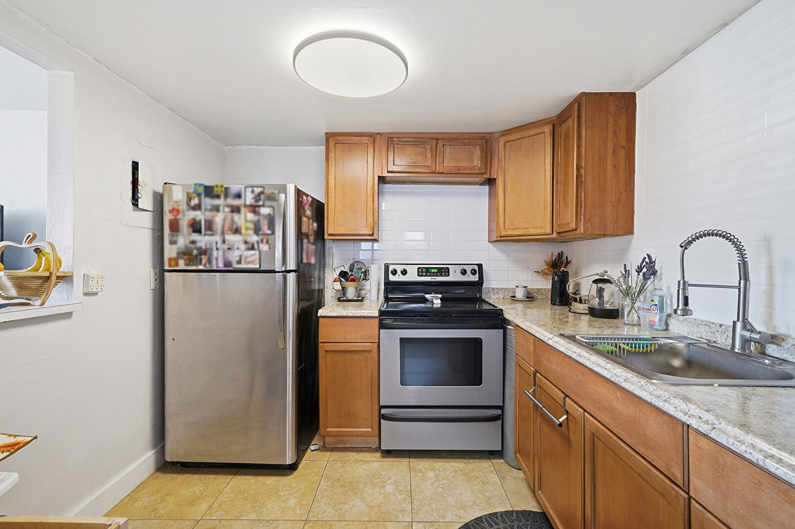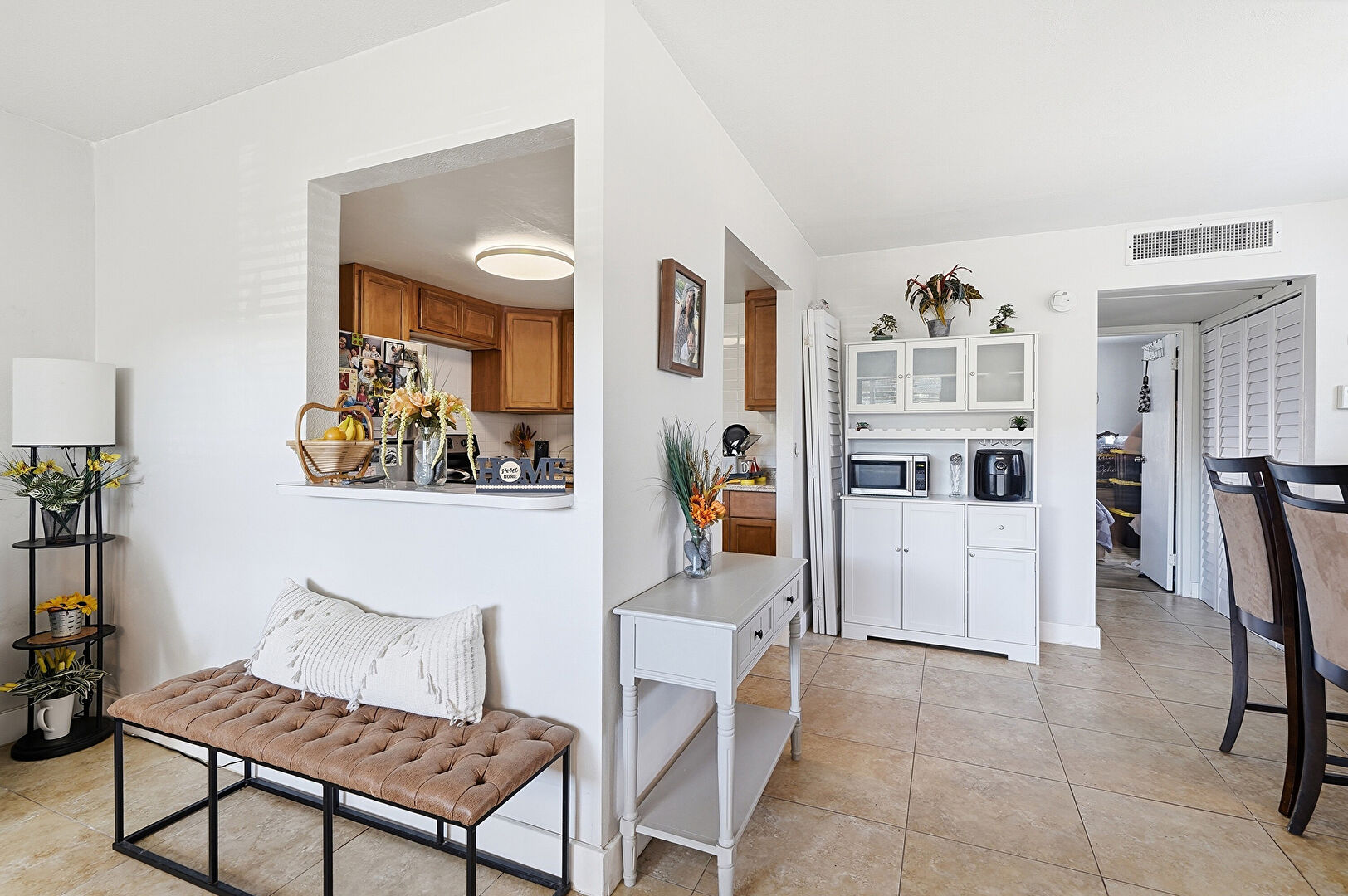 Baseboards Wall, Drywall, Glass Insert Cabinets, Medium Brown Cabinets, Natural Light, Pass Through Window, Shaker Cabinets, Smoke Carbon Monoxide Detector, Stone Countertops, Tile Floor, Vent, Drywall, Medium Brown Cabinets, Tile Floor